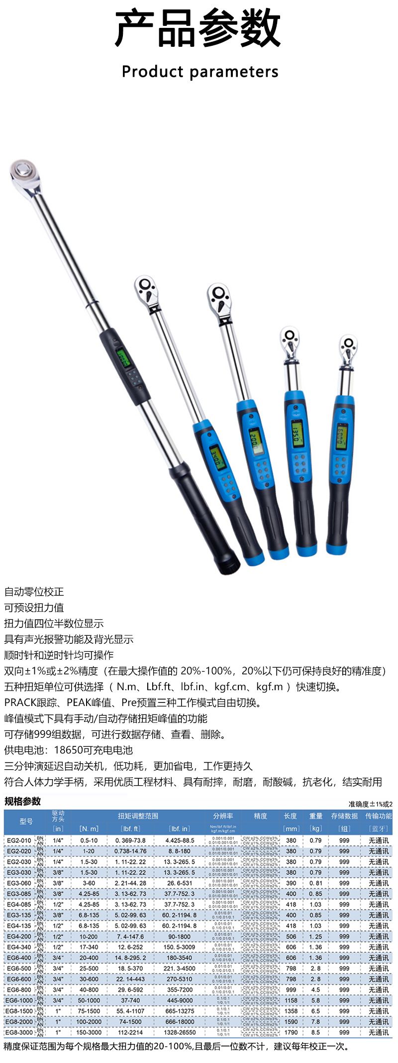 EG系列数显扭力扳手,具备±1%或±2%高精度,支持扭力预置、声光报警及999组数据存储。提供跟踪、峰值、预置三种工作模式,采用可充电电池与人体工学设计,满足工业级精准拧紧需求。