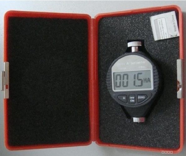 C型适用于橡塑并用、塑料中含有发泡剂制成的微孔材料D型适用于一般硬橡胶、树脂、压可力、玻璃、热塑性橡胶、印刷板、纤维等。符合标准DIN53505,ASTMD2240,JISR72152.概述邵氏橡胶硬度计是测定硫化橡胶和塑料制品硬度的仪器,该仪器有A型、D型、C型三种形式A型和D型分别适用于低中硬度和高硬度材料的测试。C型适用于压缩为50%,应力0.049MPa以上时,采用橡塑并用,塑料中含有发泡剂制成的鞋用微孔材料硬度的测试。本硬度计执行GB/T531-99,GB2411-80,HG/T2489-93,JJG304-2003有关规定。3.主要参数刻度盘值:0-100度压针行程:0-2.5mm压针端压力:A/C型0.55N-8.06N,D型0-44.5N4.使用方法把式样放置在坚固的平面上,拿住硬度计,压针距离试样边缘至少12mm平稳的把压足压在试样上,使压针垂直的压入试样,直至压足和试样完全接触时1S内读数。在测点相距至少6mm的不同位置测试硬度值5次,取其平均值(微孔材料测点相距至少15mm)。为稳定测试条件,提高测试精度,应将硬度计装置在配套生产的同型号测定架上测定。5.使用须知使用前应检查硬度计的指针在自由状态下应显示为零,(如不显示为零,使用清零键ZERO清零)。将硬度计压在玻璃板时,应显示100度(压针端面与压脚底面严密接触与玻璃板上)。如不指示0和100度时,可以轻微按动压针几次,如仍不显示0和100度时,则不能使用。如在定荷架上使用时,可以按动手柄,使硬度计在砝码重力作用下,硬度计压足和测试台完全接触,此时数值显示应100±1度,可以使用试验台下两个调节手轮微调,如仍调不到100±1度,同样不可以使用,做好送厂方调整为宜。D型硬度计手持压在玻璃上检验零位时货装置在定荷测定架上调整零位时,必须在硬度计压足下放置坚硬的专用量块,否则,硬度计压头会压损玻璃板,而且很难准确示值。橡胶试样应按GB/T631-99的要求制备,塑料试样应按GB2411-80的要求制备,橡胶微孔材料的试样应按GB2489-93的要求制备在可能的情况下橡塑试样在测定前应按照GB0T2941/GB/T2918的规定在实验室标准温度下进行调节后再测定。当试样用A型硬度计测量值超过90度时,推荐使用D型硬度计,当D型硬度计测量值低于20度时,推荐用A型硬度计。A型硬度计示值低于10度时是不准确的,测量结果不能使用。硬度计在使用完毕后,应擦净装入仪器盒内,放置干燥处,防止受潮。